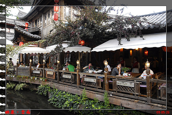 麗江古城「酒吧一條街」北起古城北口大水車,南至四方街科貢坊,由一座座木質老宅改造,一座座簡易木板橋相連,沿新華街玉水河兩岸分佈。用’鱗次櫛比’形容還算是輕的,在新華街街中心地段,除了酒吧還是酒吧。當然,這是廣義的酒吧是多功能的,即是酒吧,也是茶館、咖啡館、餐廳以及Disco舞廳。
